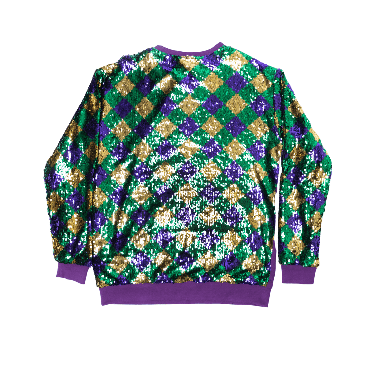 • Festive Design: Bold "MARDI GRAS" lettering on the front with dazzling sequin sleeves and back
