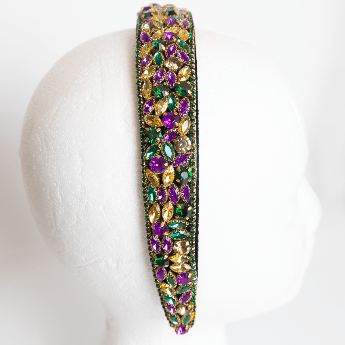 - Intricately set with sparkling rhinestones in traditional Mardi Gras colors: Purple, Green, and Gold.