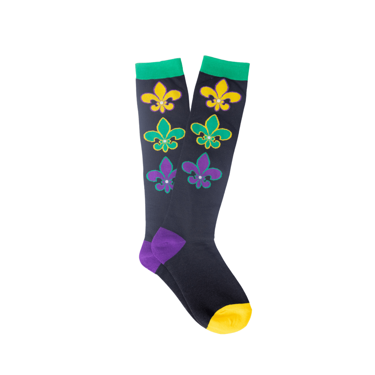 Step into Mardi Gras with these MG Knee High FLDS Socks - Black! Designed with fleur de lis patterns in festive purple, green, and gold, these knee-high socks bring the ultimate parade-ready look. Crafted from a soft and stretchy fabric, they provide all-day comfort and a secure fit, making them a must-have for any Mardi Gras celebration.