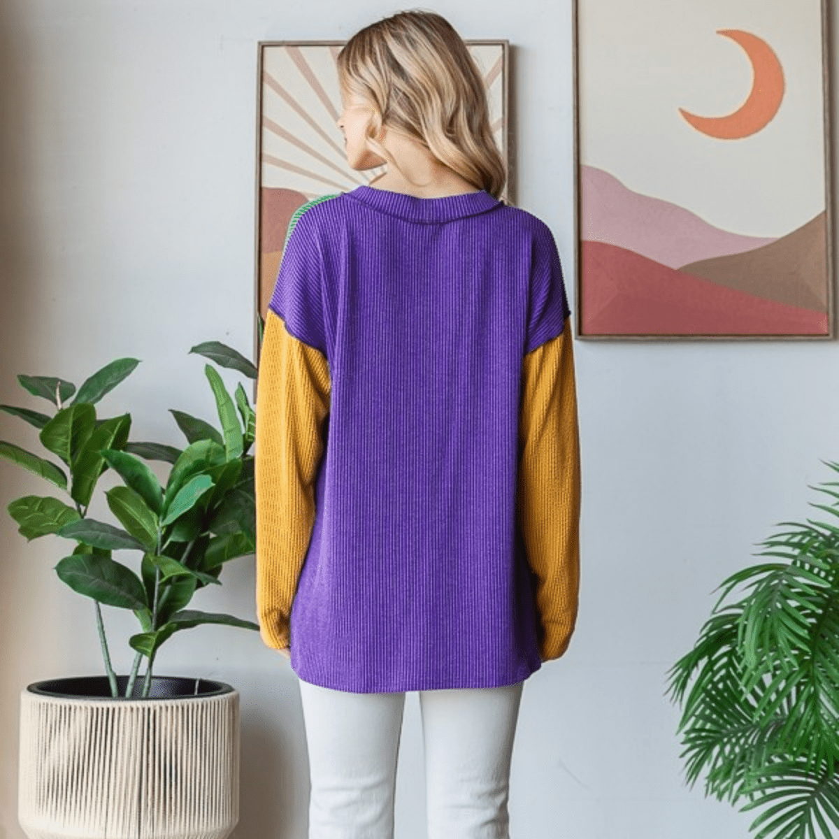 Step into effortless style with the Mardi Gras Long Sleeve Urban Rib Color Block Top! Designed with a trendy oversized fit, this top features a striking color-block pattern in bold Mardi Gras hues—purple, green, and gold. The soft ribbed texture adds a stylish touch, while the V-neckline and front pocket detail bring both comfort and flair. Perfect for festive celebrations or casual outings, this top is a must-have for the season!