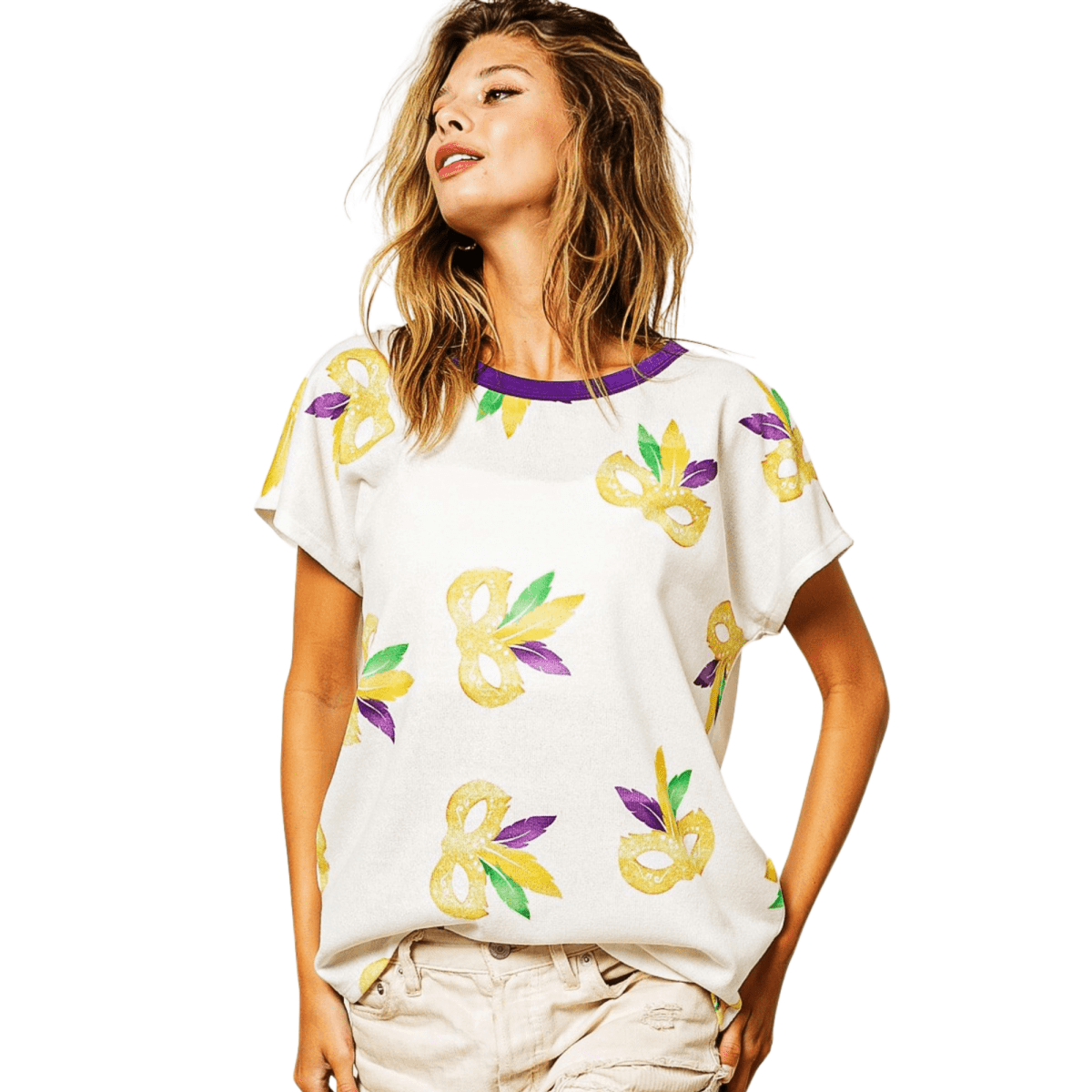 Get festive in style with the Mardi Gras Mask Print Contrast Neck Top! Featuring a bold gold mask print with vibrant feather accents, this top is a perfect way to celebrate the season. The contrast purple neckline adds a stylish touch to the relaxed fit, making it an easy-to-wear piece for parades, parties, or casual outings.
