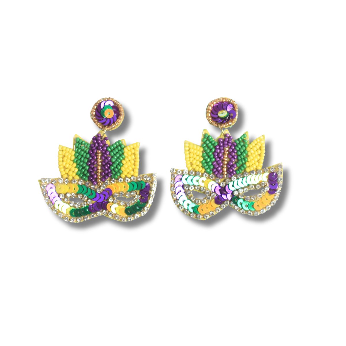 Celebrate Mardi Gras in style with these unique Mardi Gras Mask Sequin Drop Earrings. Crafted in the shape of festive Mardi Gras masks, these earrings feature vibrant sequins and beaded details in traditional colors of green, gold, and purple, outlined with shimmering rhinestones. Lightweight and playful, they are perfect for adding a touch of carnival spirit to any outfit. Ideal for parades, parties, or any Mardi Gras celebration, these earrings are sure to make you stand out!