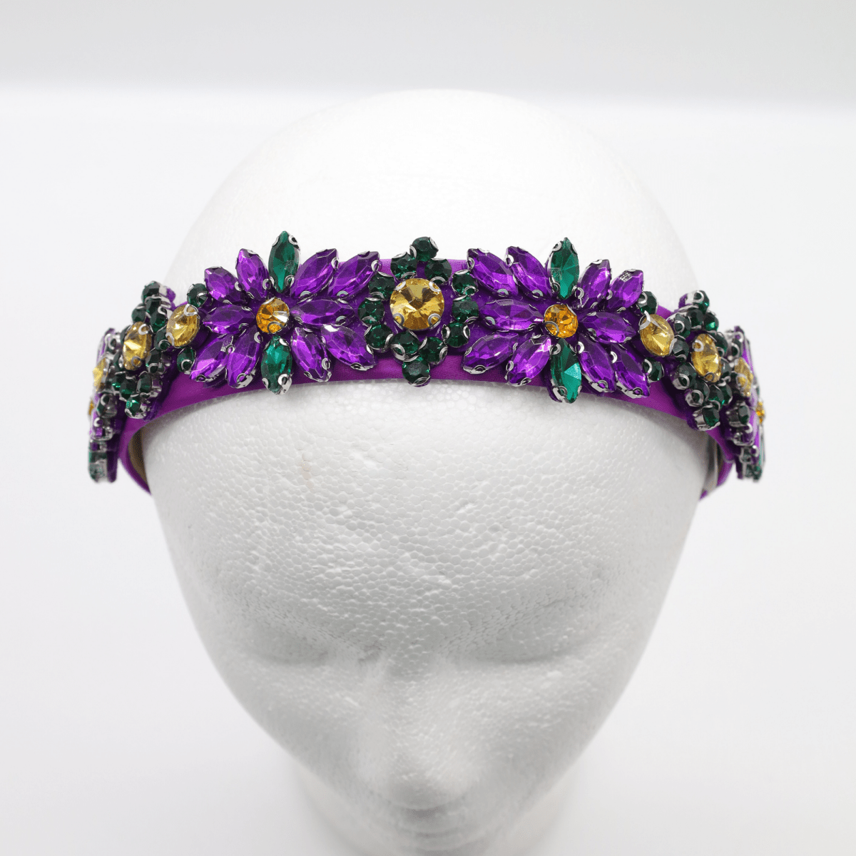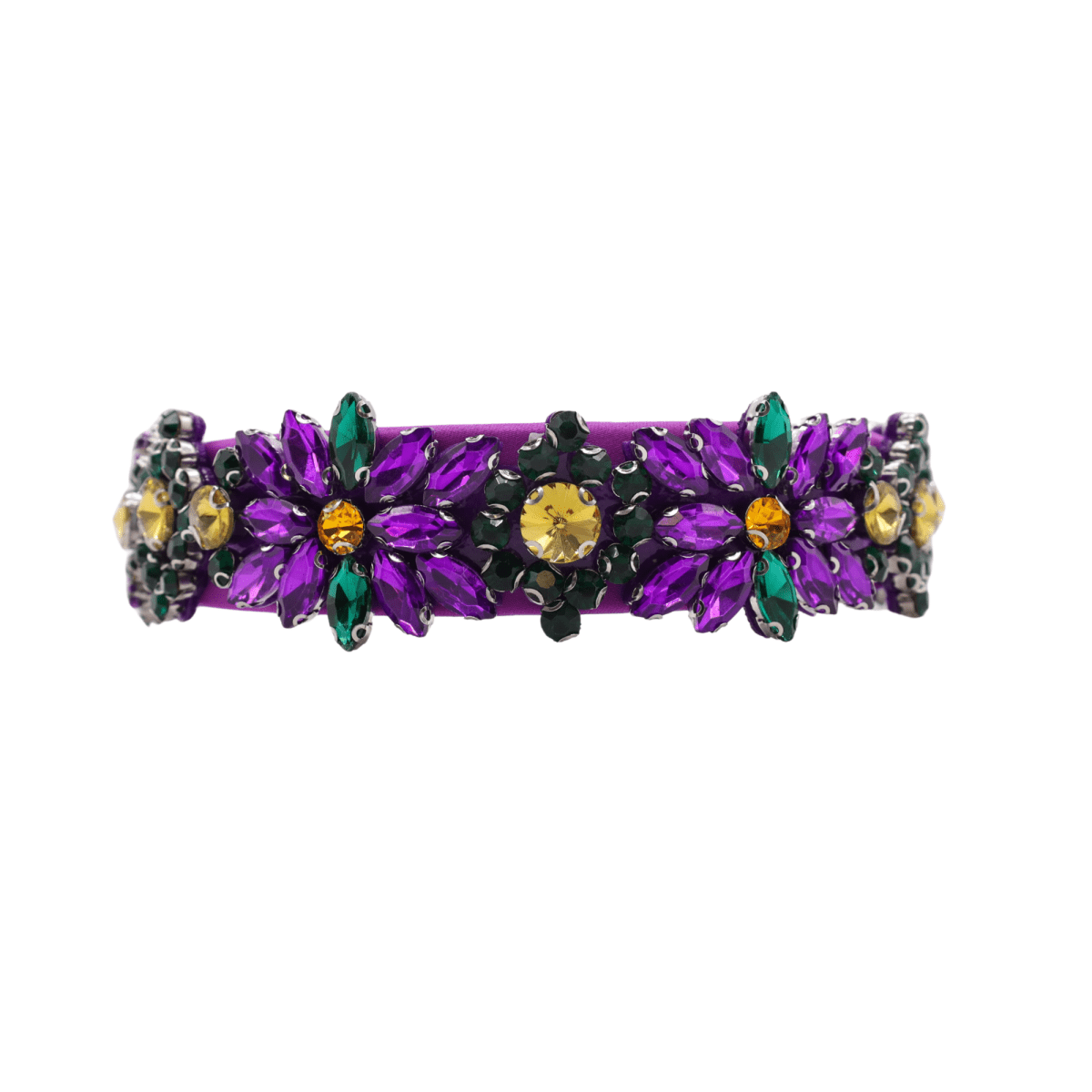 Turn heads this Carnival season with our Mardi Gras Purple Floral Rhinestone Headband for Women, a dazzling accessory that embodies the vibrant energy of New Orleans celebrations. This stunning headband features rich purple fabric adorned with intricate floral rhinestone clusters in green and gold the traditional Mardi Gras colors that symbolize justice, faith, and power. Each jewel sparkles brilliantly, catching the light as you dance, parade, or party through the festivities. The padded base ensures a secure, comfortable fit, making it ideal for all-day wear. Whether you’re dressing up for a Mardi Gras parade, costume ball, or simply adding festive flair to your outfit, this headband combines elegance and fun in perfect balance. Lightweight yet durable, it’s a must-have for any Mardi Gras queen ready to shine in style. Pair it with coordinating jewelry or a masquerade mask for a truly regal look!