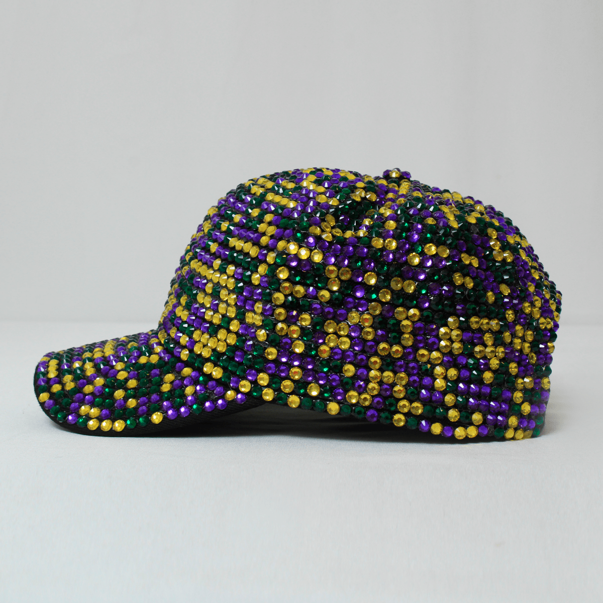 Elevate your Mardi Gras celebration with this dazzling Rhinestone Baseball Cap. Fully adorned with vibrant purple, gold, and green rhinestones, this cap merges festive flair with casual comfort. Designed as a structured, non-adjustable baseball cap, it provides a stylish one-size solution for most adults. Perfect for parades, parties, or adding sparkle to your everyday look, this cap is a must-have accessory for the season.