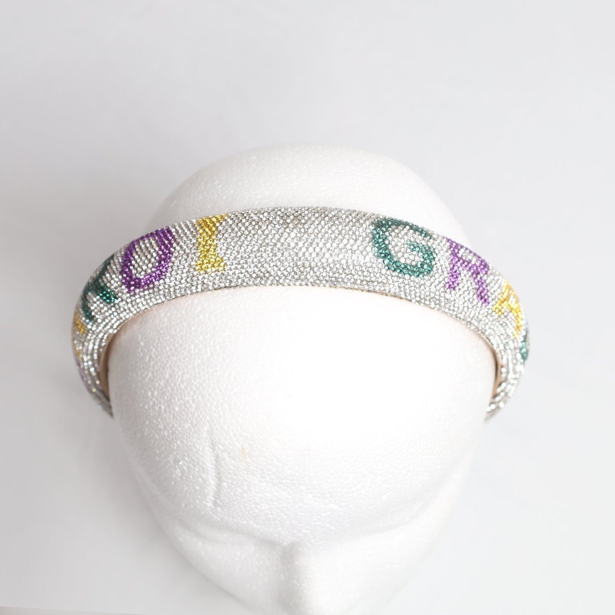 Elevate your Mardi Gras celebration with this stunning rhinestone-embellished headband. Designed with intricate rhinestone detailing, this headband features the festive Mardi Gras colors of purple, green, and gold in a playful and bold pattern. Perfect for adding a touch of sparkle to any Mardi Gras outfit, this headband is comfortable and secure, allowing you to party all day long. Whether you're at a parade, party, or casual get-together, this headband is the perfect accessory to showcase your Mardi Gras spirit in style.