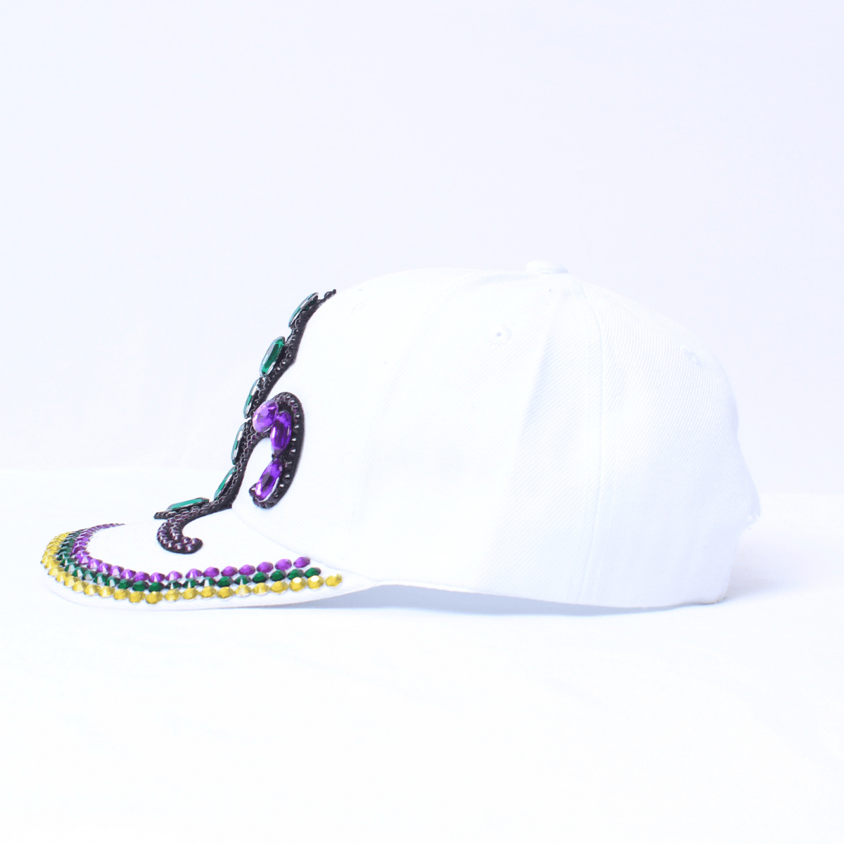 The adjustable back strap ensures a comfortable fit for most head sizes, while the crisp white base provides the perfect canvas for the colorful embellishments. The curved bill, lined with complementary rhinestones, adds extra flair to the design. Lightweight and durable, this hat is your ultimate accessory for standing out in the crowd during Mardi Gras festivities.