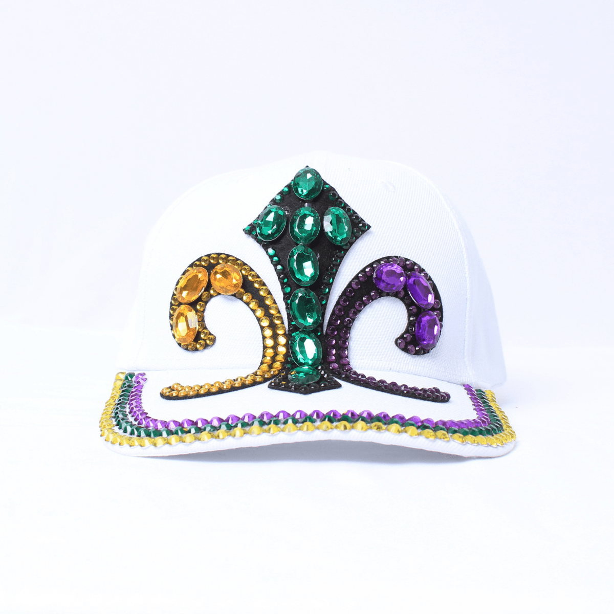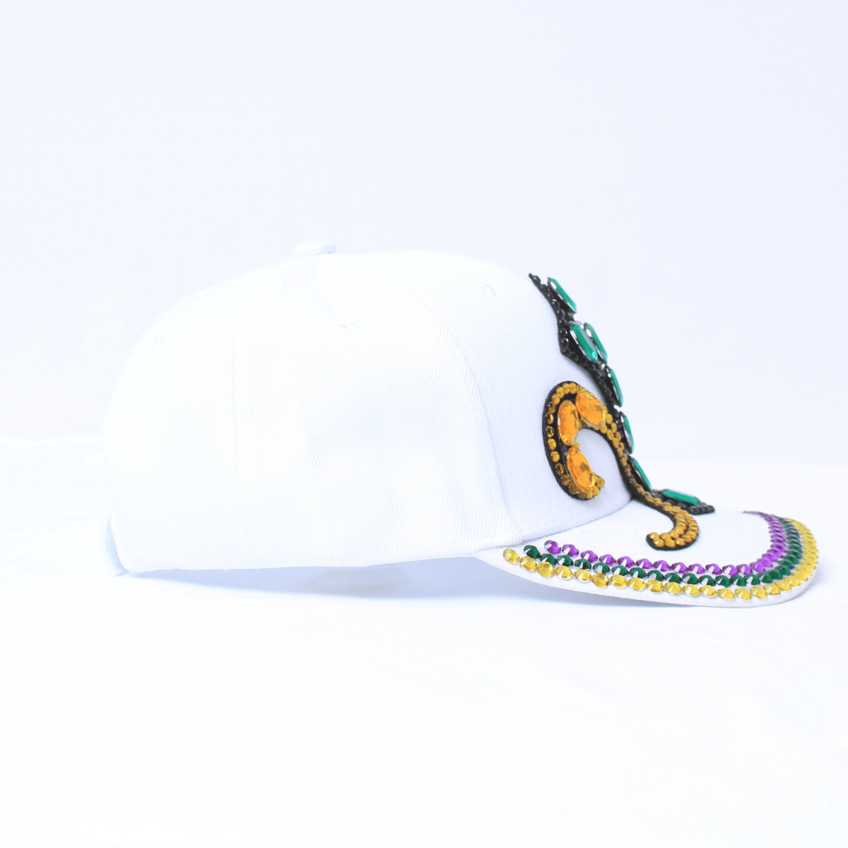 Mardi Gras Rhinestone Fleur-de-Lis White Baseball Hat