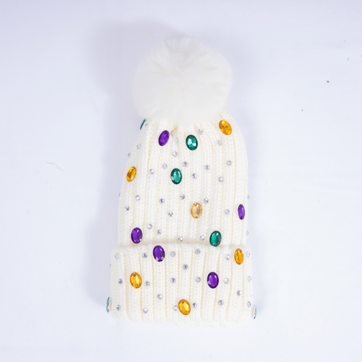 Mardi Gras Rhinestone Knit Beanie with Faux Fur Pom - White
