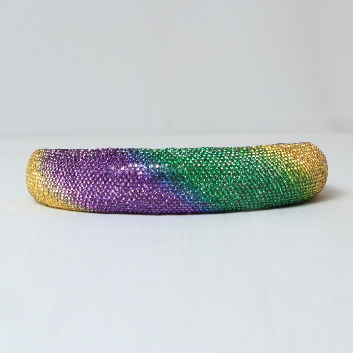 Celebrate in style with the Mardi Gras Rhinestone Padded Headband, designed to make you stand out. This luxurious accessory features a mesmerizing blend of purple, green, and gold crystals arranged in an elegant gradient pattern, exuding festive vibes and charm. Comfortable yet glamorous, the padded design ensures a secure fit while adding volume to your look.