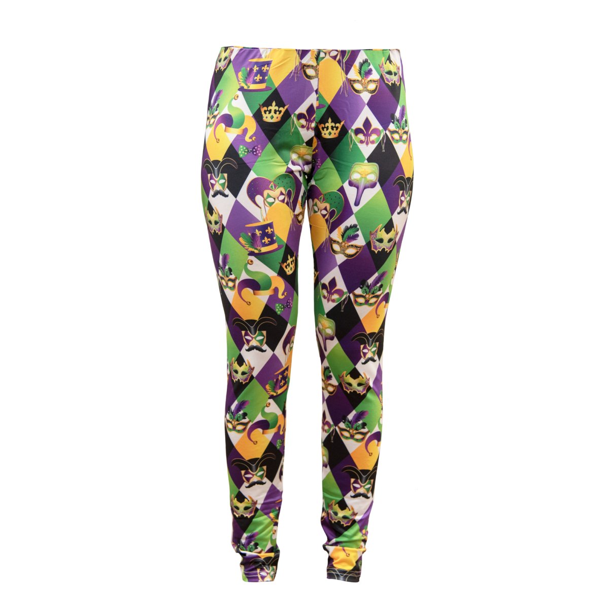 Celebrate Mardi Gras with our Carnival Comfort Leggings, a vibrant addition to your festive attire. These leggings feature a lively Mardi Gras-themed pattern with iconic symbols like fleur-de-lis, masks, and crowns, set against a dynamic color block of Mardi Gras purple, gold, and green. Made from a soft and stretchy fabric, these leggings are designed to provide maximum comfort and flexibility, allowing you to move freely as you revel in the festivities.