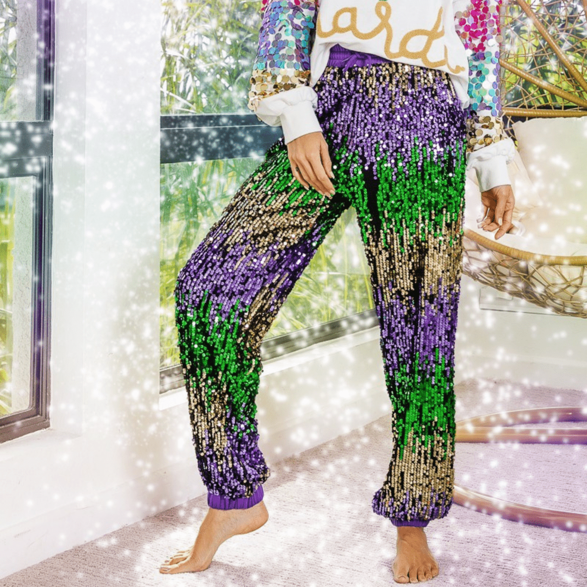 Get ready to shine and celebrate the Mardi Gras season in comfort and style with this statement pullover!