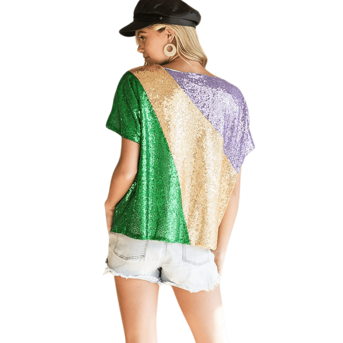 Shine bright this Mardi Gras season with our Sequin Color Blocking Top. Featuring vibrant color blocks of purple, gold, and green sequins, this short sleeve top is designed to make you stand out in any parade or party. The inside lining ensures a comfortable fit while keeping you sparkling all day long. Pair it with jeans, shorts, or a skirt to complete the festive look!
