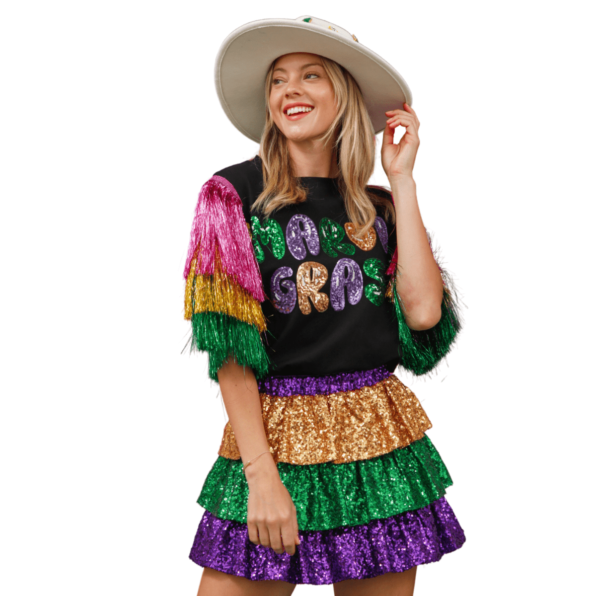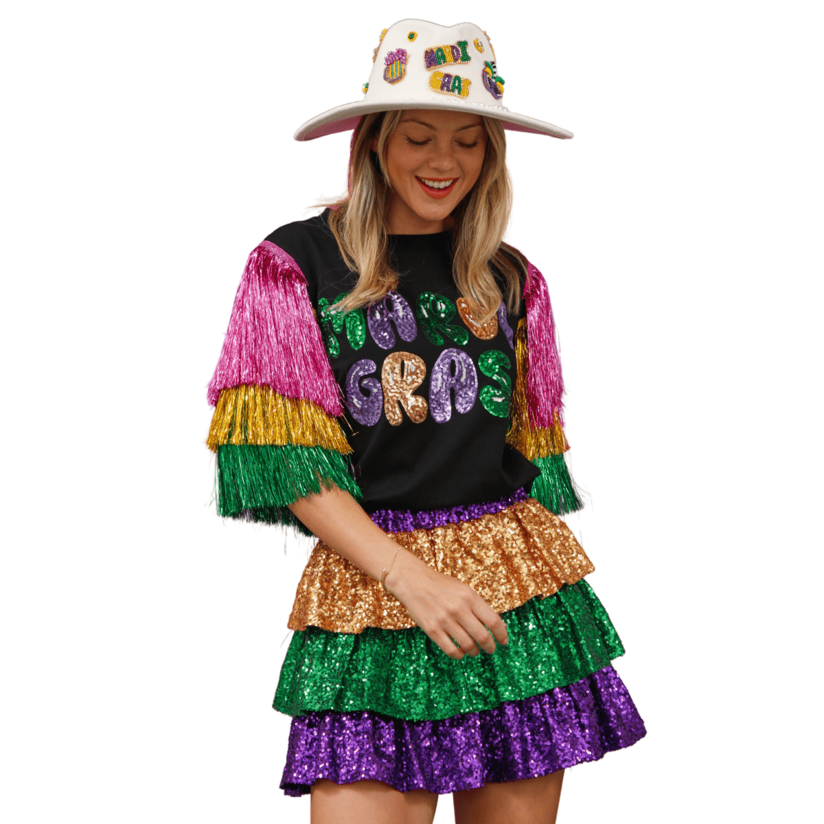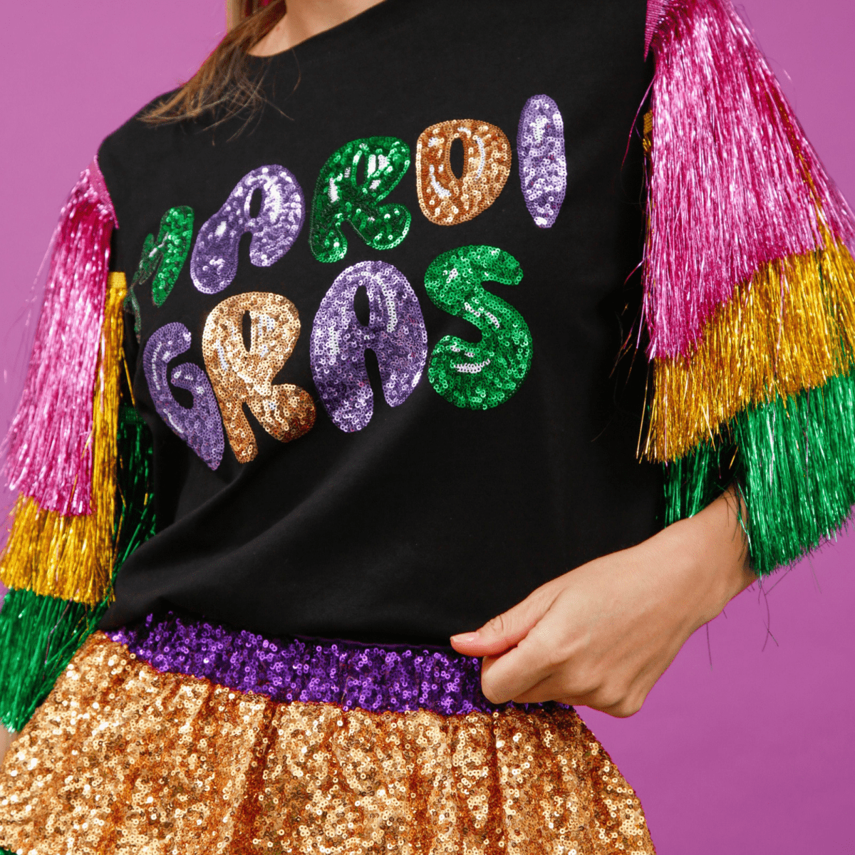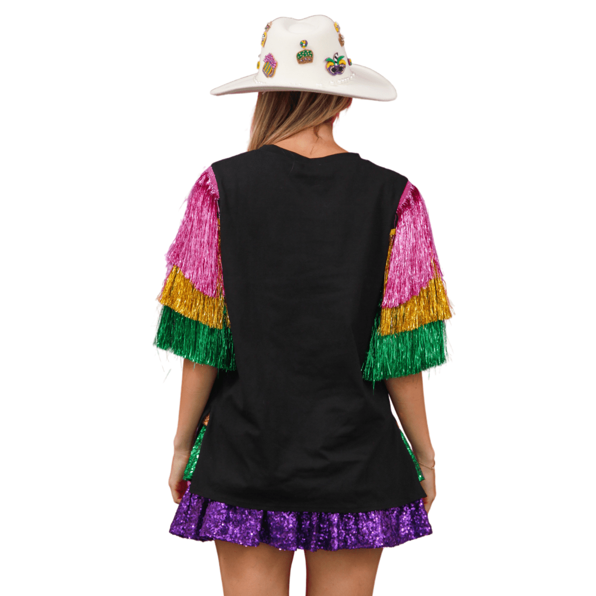 Make a bold entrance this Mardi Gras season with the Mardi Gras Sequin Patch Black Top With Foil Tassels! This festive top features sparkling sequin lettering that spells out "MARDI GRAS" in vibrant purple, green, and gold. The sleeves are adorned with dramatic foil tassels in matching Mardi Gras colors, adding playful flair to your outfit. Designed for both comfort and style, this top ensures you’ll shine bright at every parade, party, or celebration.