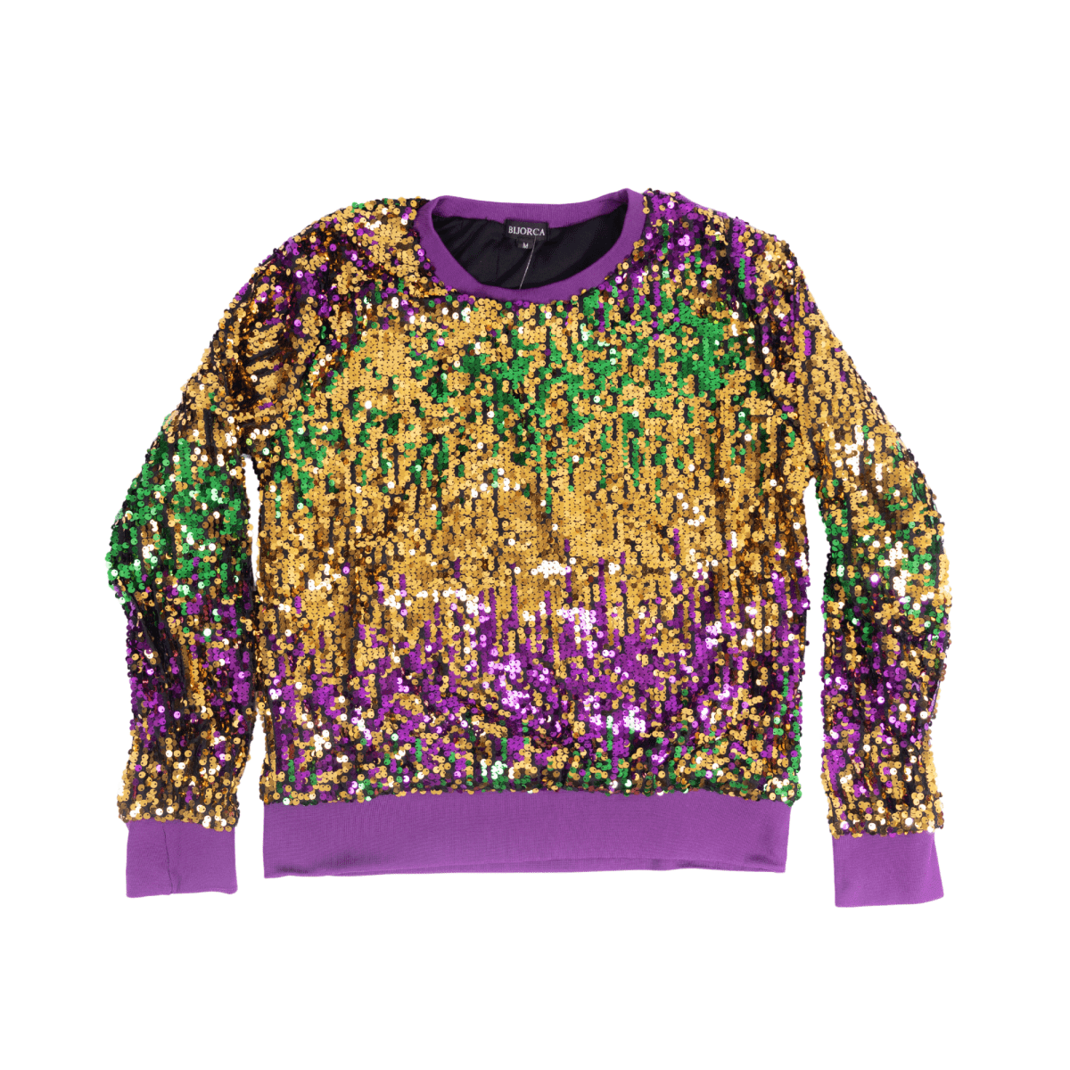 Step into the Mardi Gras spotlight with our dazzling Mardi Gras Sequin Pullover Sweatshirt. Designed for those who love to stand out, this festive top features a stunning gradient of shimmering purple, green, and gold sequins, reflecting the vibrant colors of Mardi Gras traditions. Whether you're heading to a parade, hosting a Mardi Gras party, or simply celebrating in style, this sweatshirt combines comfort and glamour for the perfect festive look.