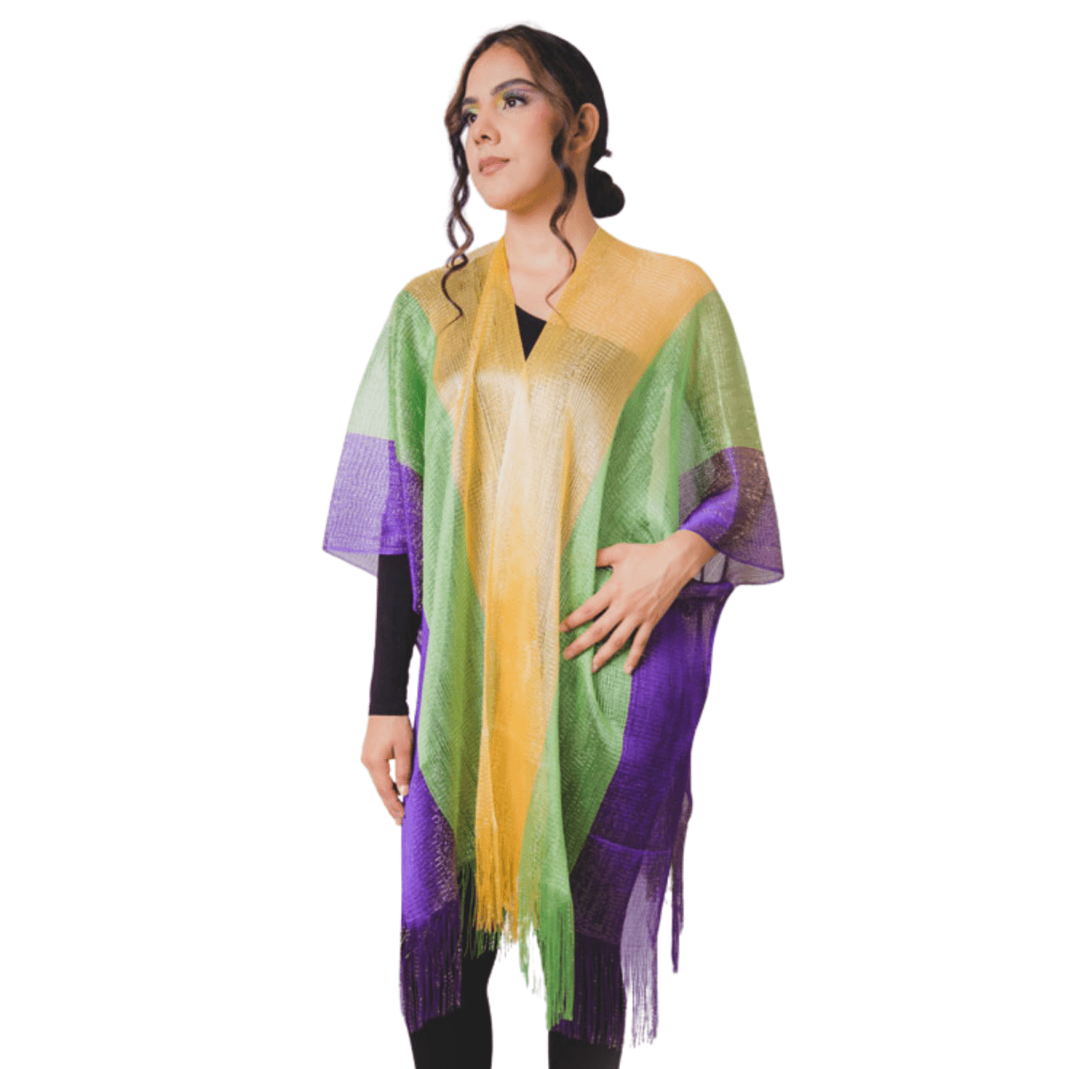 Add a touch of elegance to your Mardi Gras ensemble with the Mardi Gras Sheer Metallic Fringe Wrap! Designed with a stunning metallic gold, green, and purple color combination, this lightweight shawl drapes effortlessly for a glamorous look. The sheer fabric adds sophistication, while the delicate fringe detail enhances movement, making it the perfect accessory for parades, parties, and festive occasions.