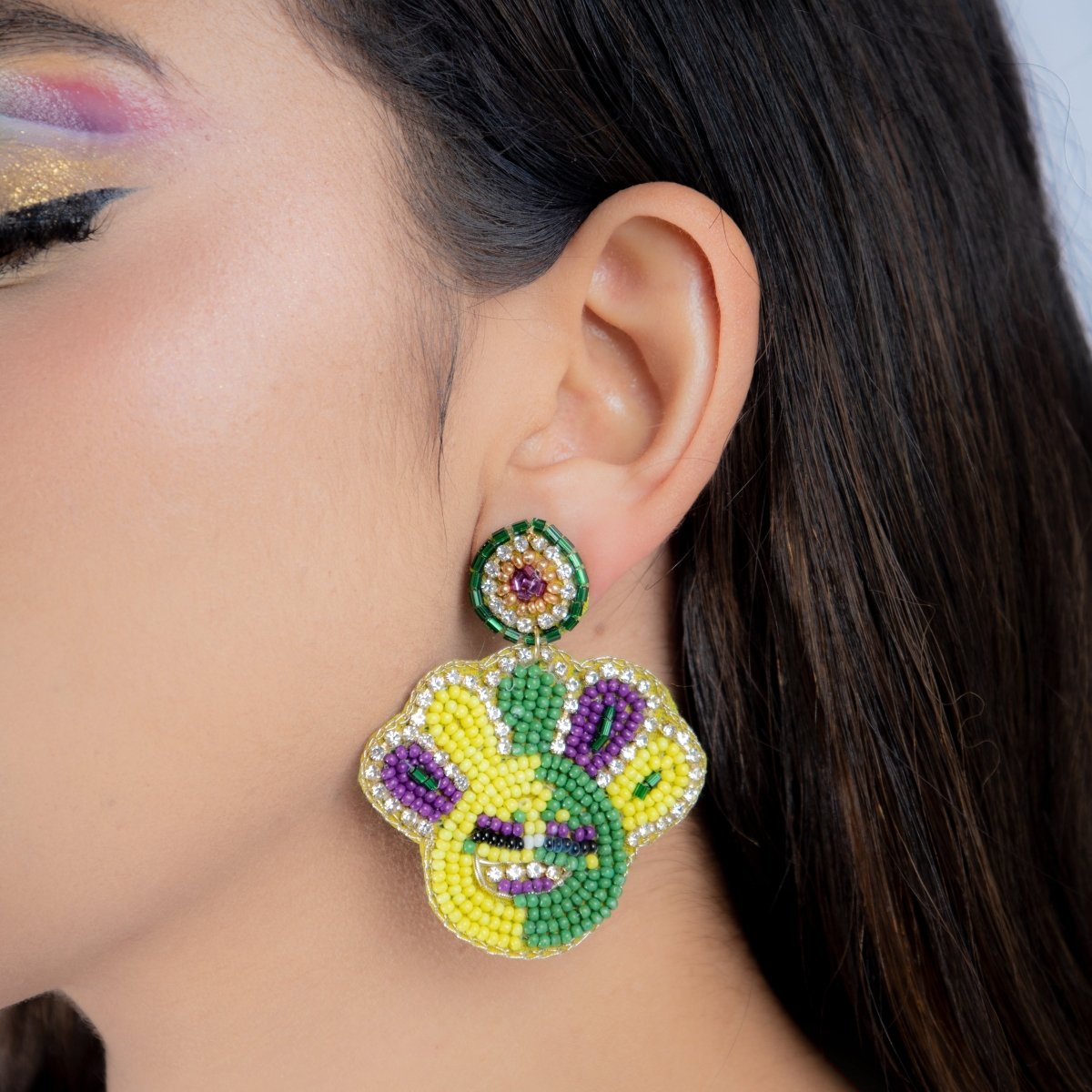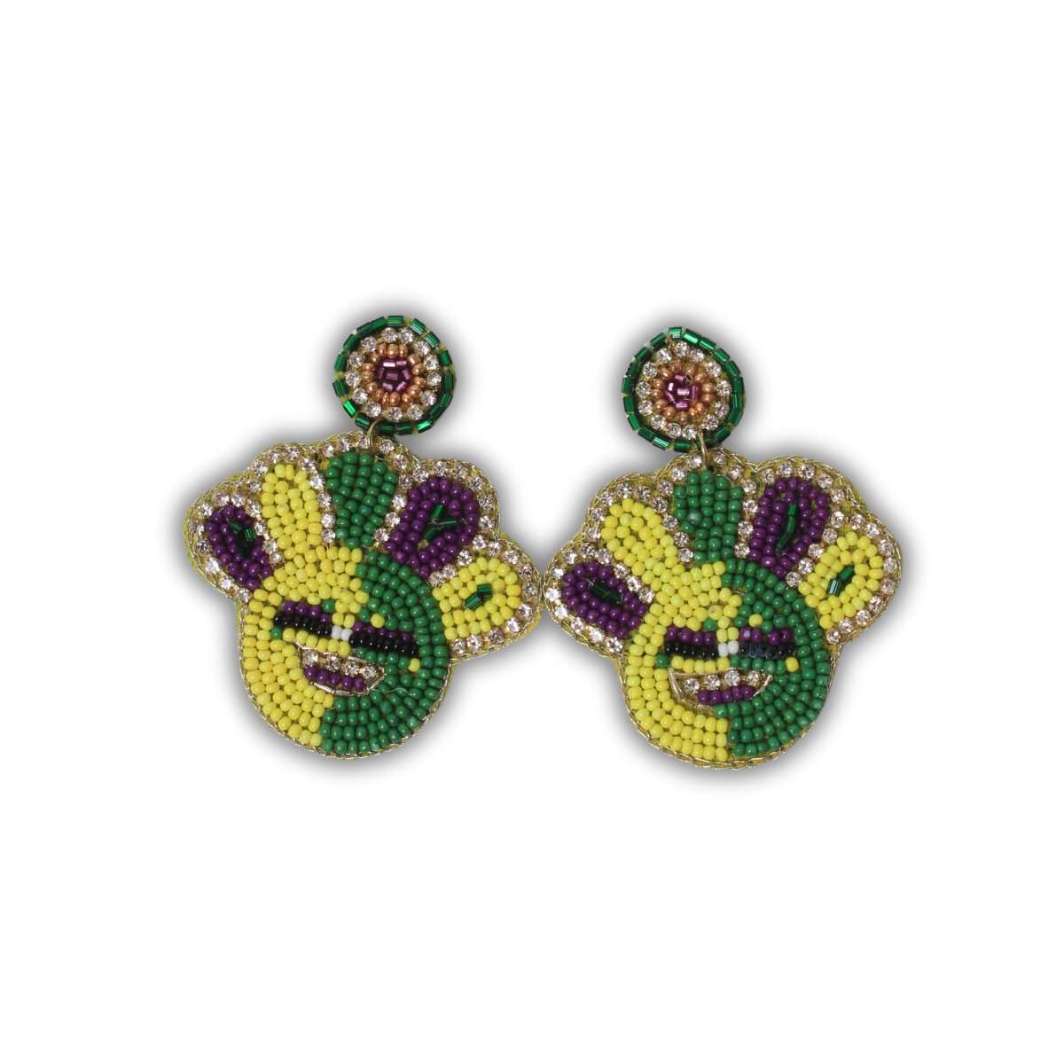 Mardi Gras Smiley Face Beaded Earrings with Rhinestones