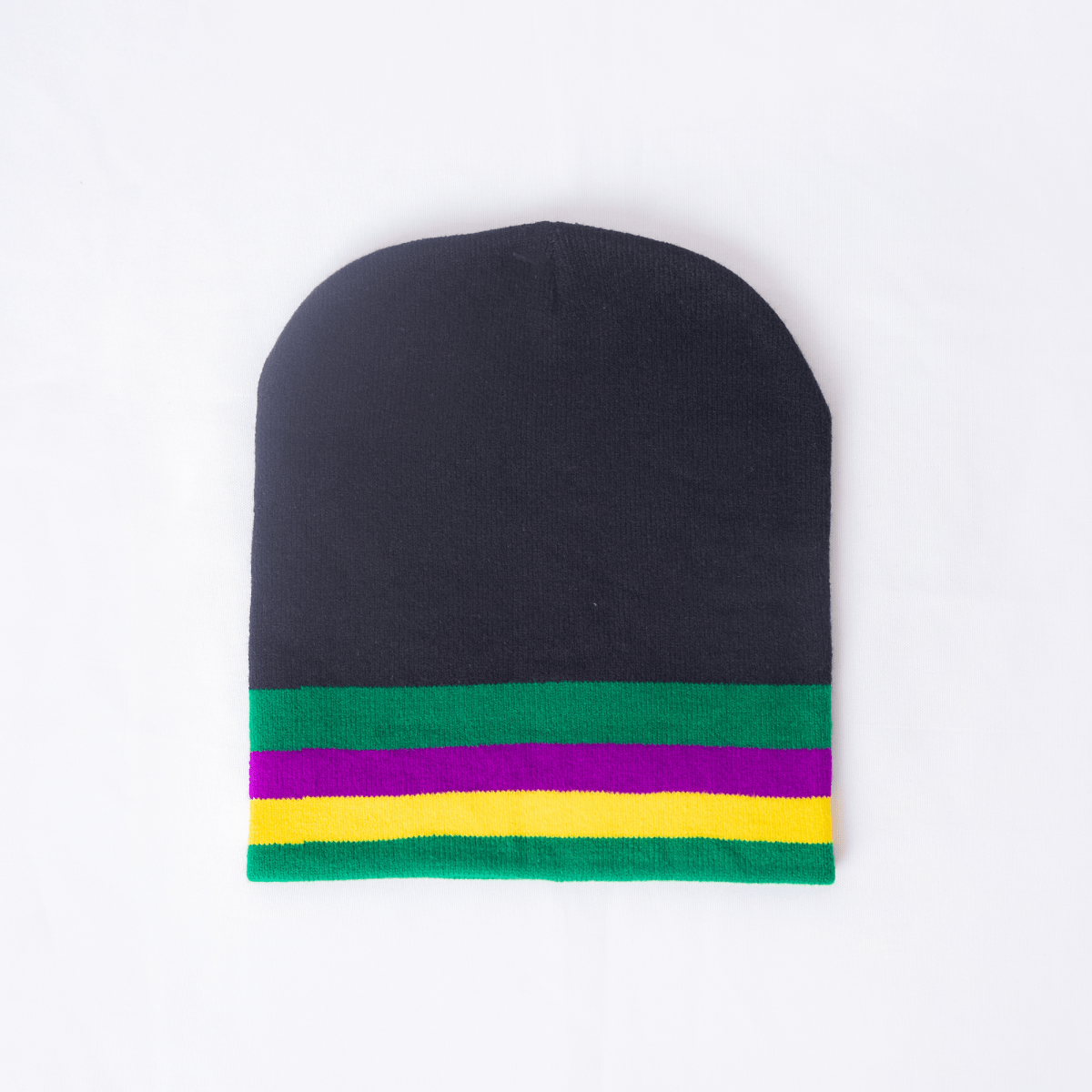 Mardi Gras Striped Knit Beanie – Black with Green, Purple & Gold Trim
