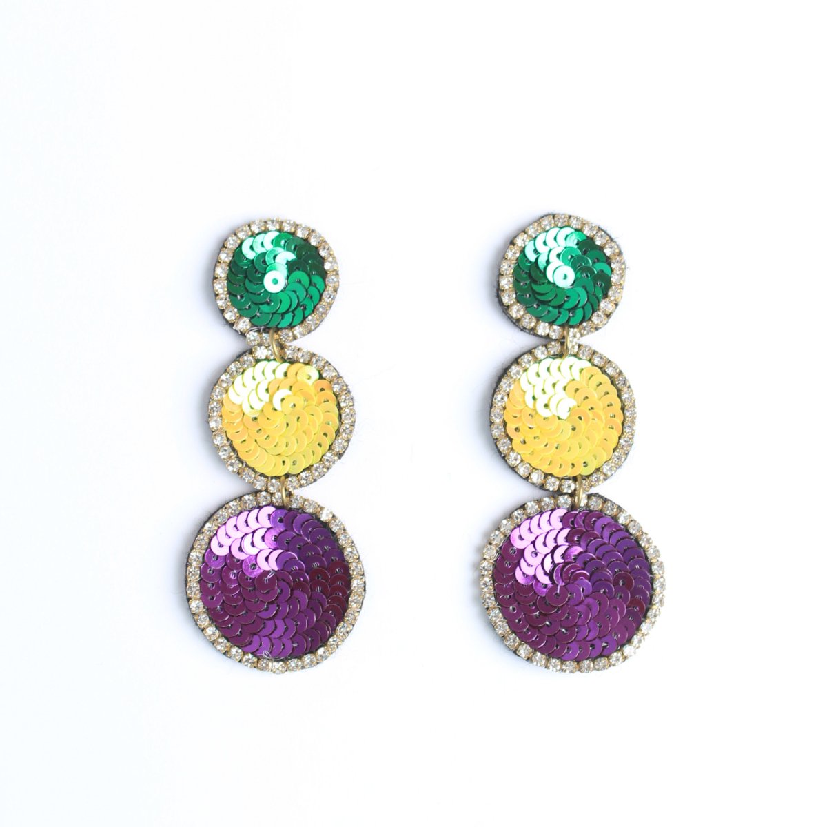 Step up your Mardi Gras style with these dazzling Mardi Gras Triple Sequin Circle Earrings. Featuring three vibrant sequin circles in traditional Mardi Gras colors of green, gold, and purple, each outlined with a delicate line of shimmering rhinestones, these earrings are perfect for adding a festive touch to any outfit. Lightweight and comfortable, they’re ideal for parades, parties, and all your Mardi Gras celebrations. Make a statement and celebrate in style with these eye-catching earrings!