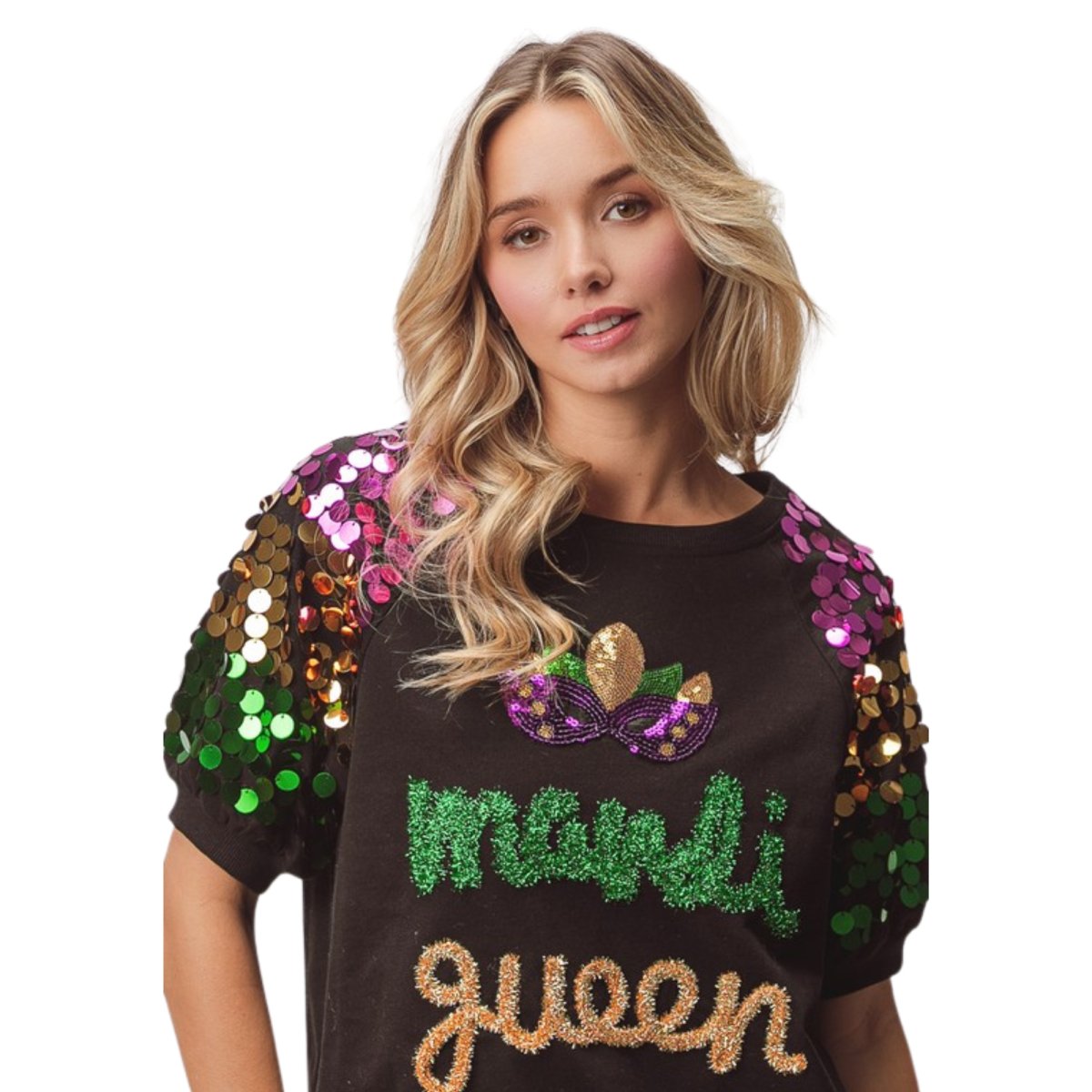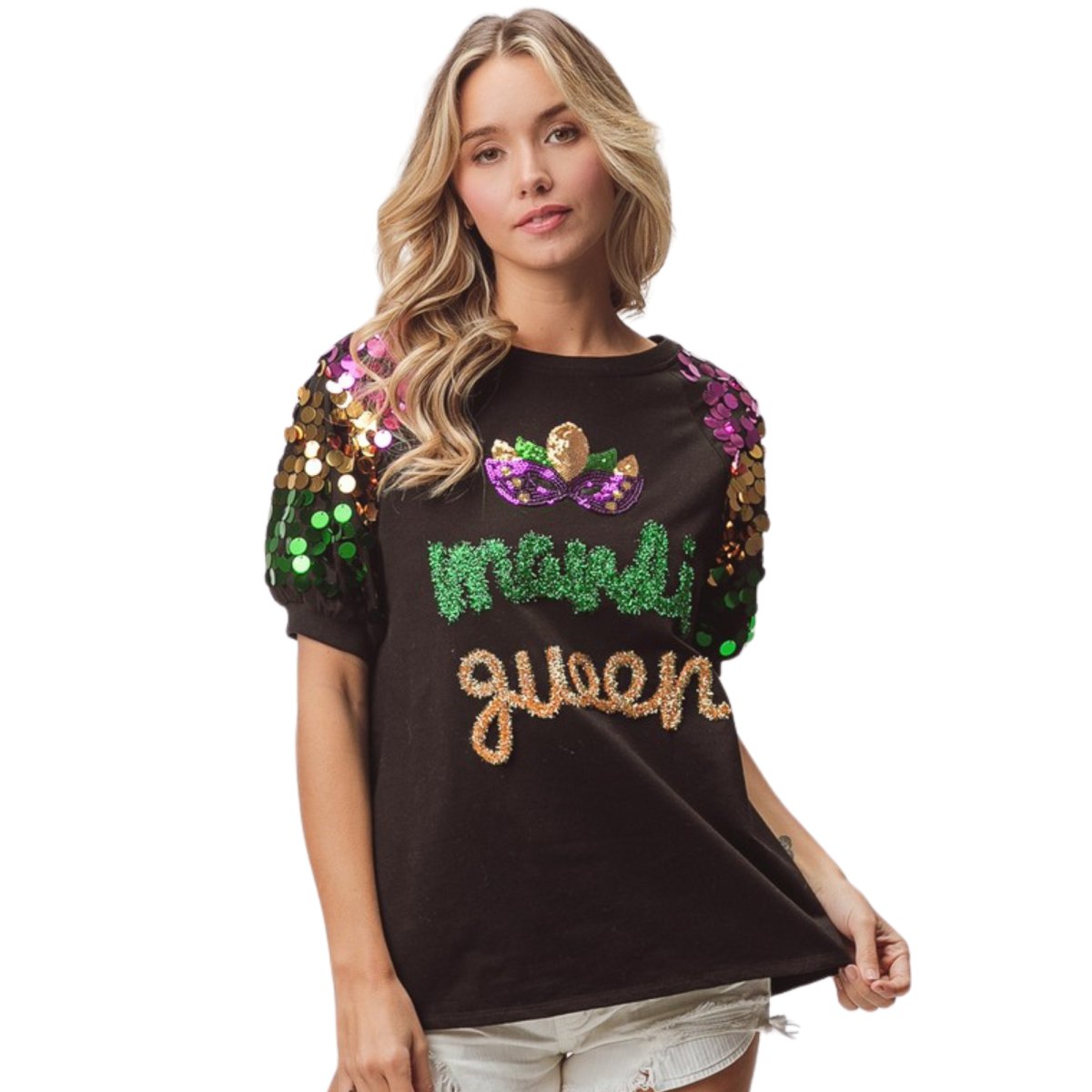 Embrace the festive fervor with the "Mardi Queen" Sequin Mask Patch Spangled Sleeve Top. This top dazzles with its sequined sleeves and sparkling mask motif, making it a standout piece for any Mardi Gras celebration.
