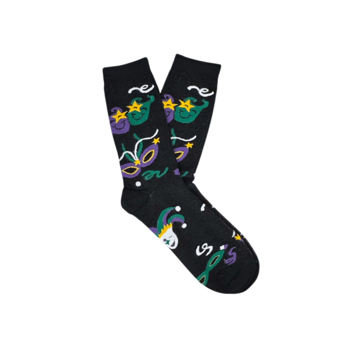 Step into Mardi Gras spirit with these Men's Mardi Gras Jester Mask Crew Socks! Designed for ultimate comfort and style, these black crew socks feature a vibrant Mardi Gras-themed print with jester masks, masquerade masks, and festive patterns in traditional purple, green, and gold colors. Perfect for adding a bold and fun touch to your outfit during celebrations!
