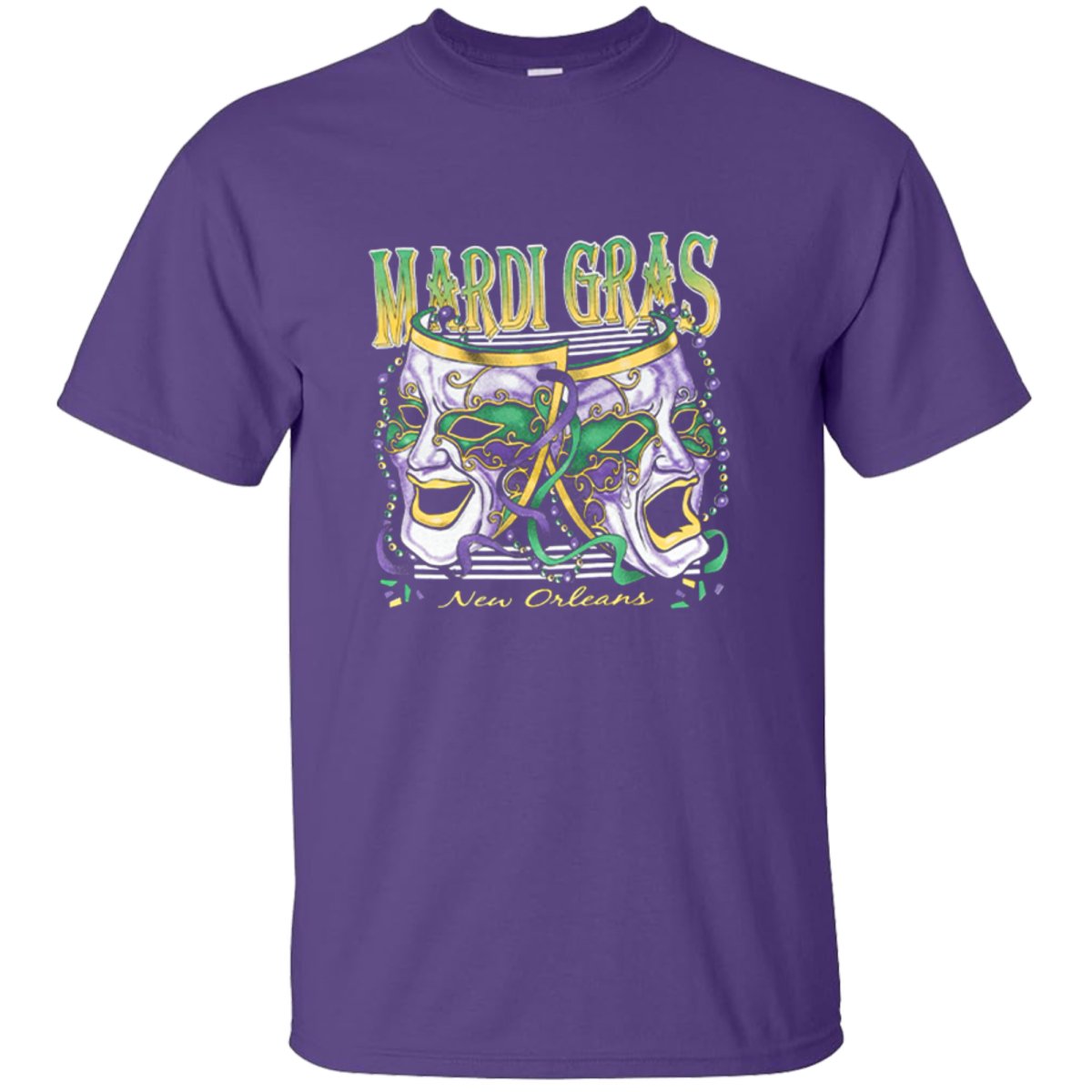 Comedy/Tragedy Design: The tee-shirt boasts a lively design featuring the iconic Comedy and Tragedy masks, capturing the contrasting emotions of Mardi Gras celebrations.