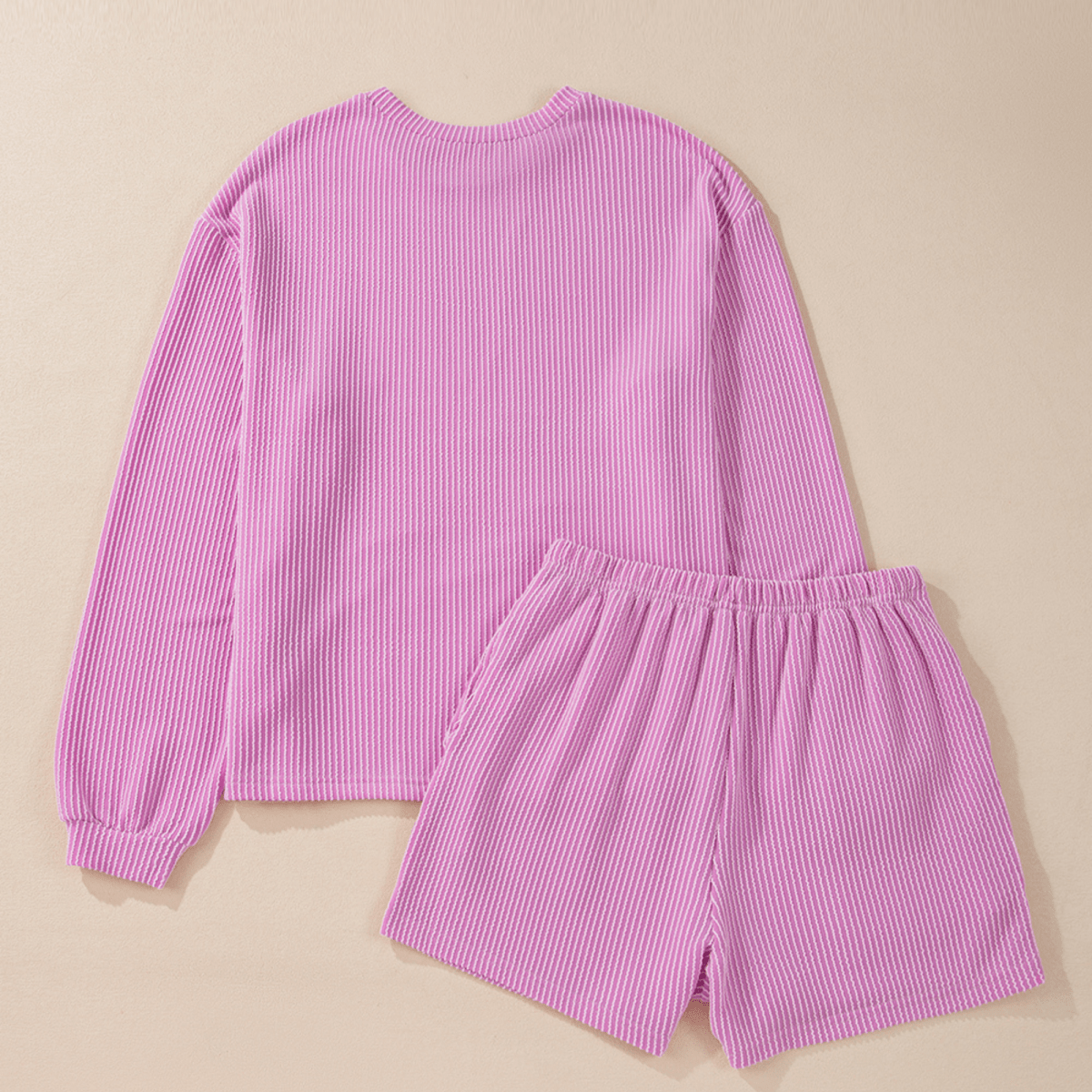 Step into Mardi Gras season in style with this Phalaenopsis Fleur de Lis Patched Corded Set! This two-piece set features a long-sleeve corded top and matching shorts, both embellished with stunning sequin Fleur de Lis patches in traditional Mardi Gras colors—purple, green, and gold. Whether you're heading to a parade, party, or lounging in festive fashion, this outfit guarantees comfort and style.