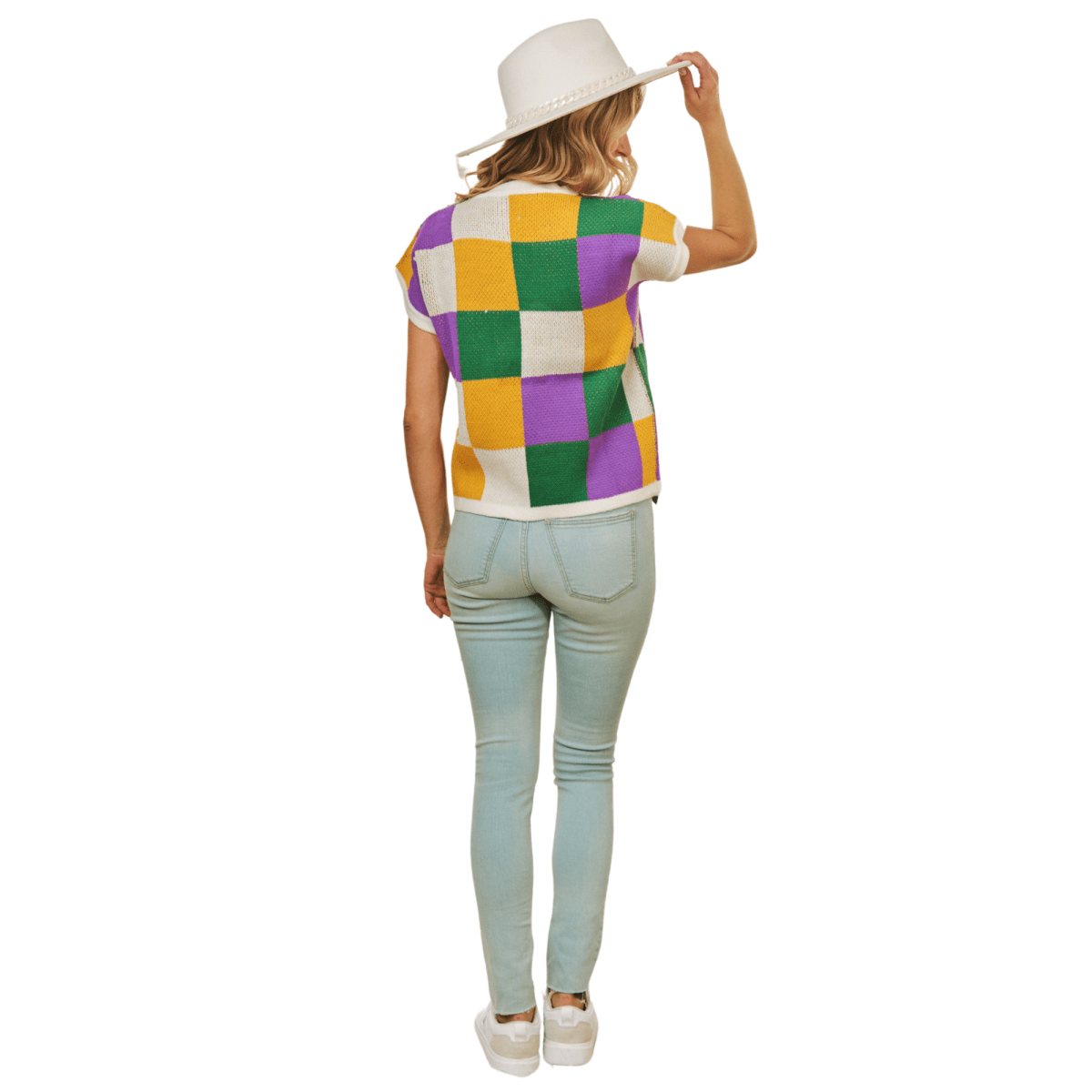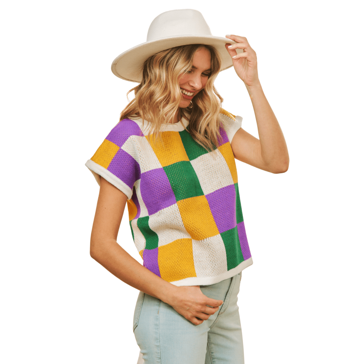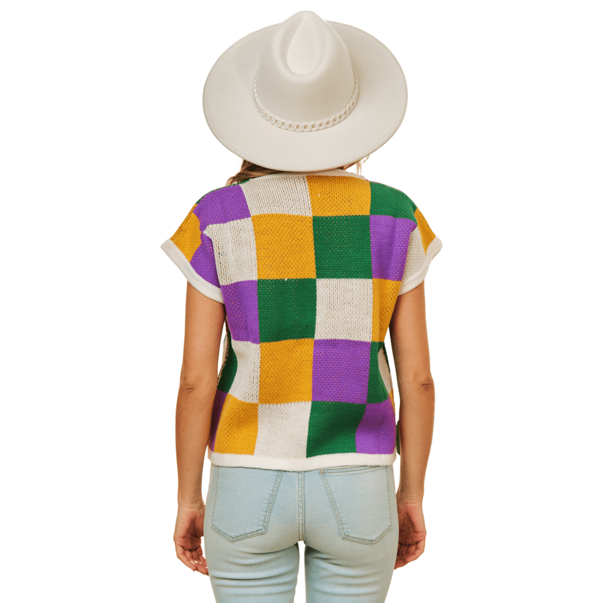 Plus Mardi Gras Colorful Checker Sleeveless Knitted Top