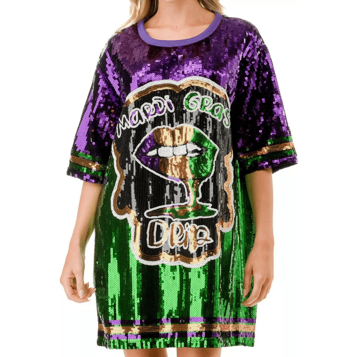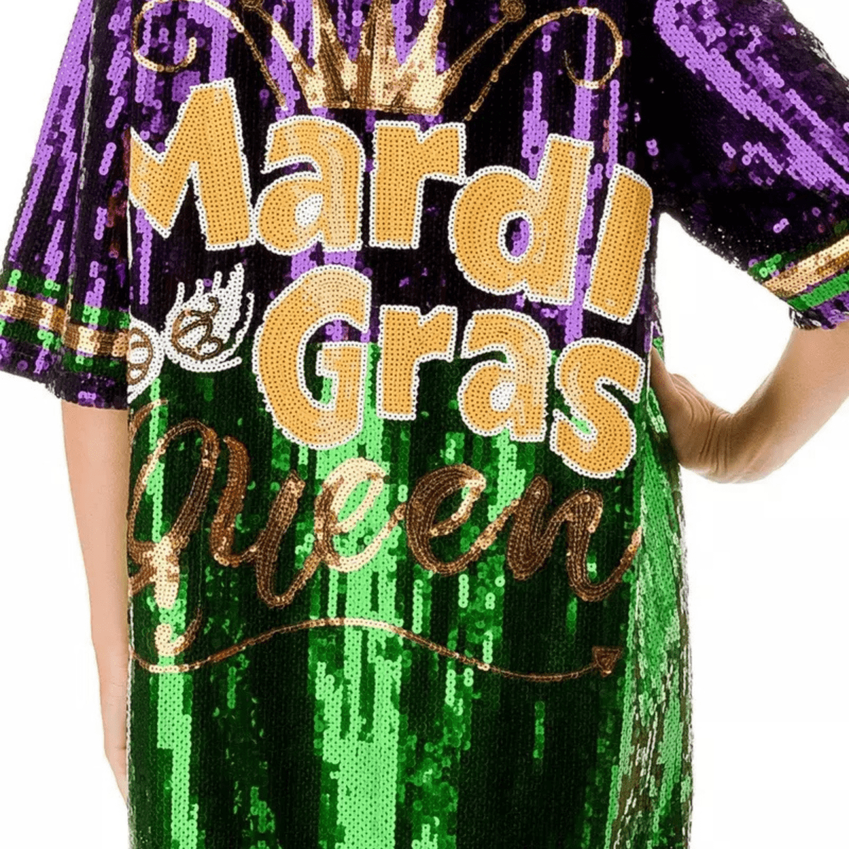 Capture the celebratory spirit from every angle with our Mardi Gras Spectacle Reversible Sequin Dress. This one-of-a-kind garment features a dual design with a majestic "Mardi Gras Queen" motif on the front and a trendy "Mardi Gras Drip" on the back, allowing you to switch up your look with a simple turn. Adorned with the vibrant purple, green, and gold sequins of the season, this dress is your ticket to being the center of attention.