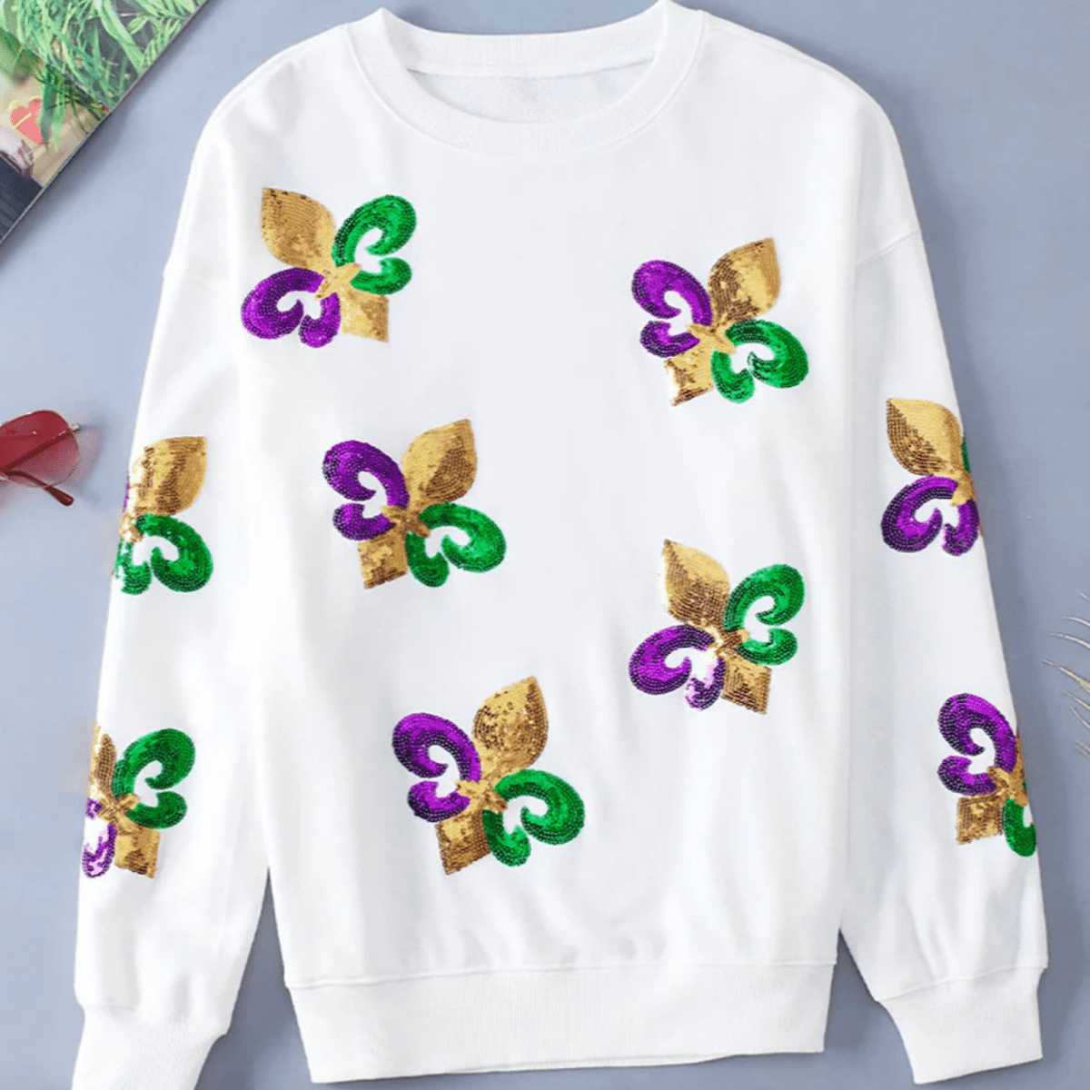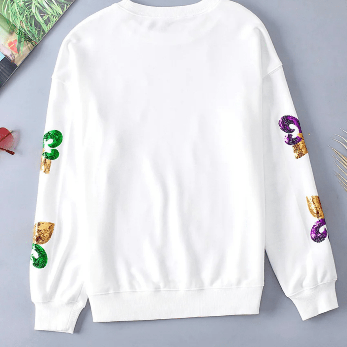 White Fleur De Lis Sequin Patches Mardi Gras Pullover