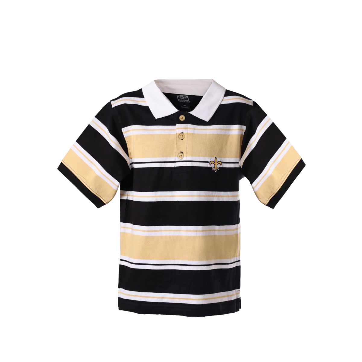 Bring classic style to the next generation with the Youth Black & Gold Striped Polo Shirt from our Black & Gold Collection. Designed with bold black, gold, and white horizontal stripes, this polo offers a sporty yet polished look for kids. The short sleeve design and breathable cotton blend provide all-day comfort, making it perfect for school, casual outings, or game days. Finished with a crisp white collar and button placket, this polo shirt keeps young fans looking sharp while staying comfortable.